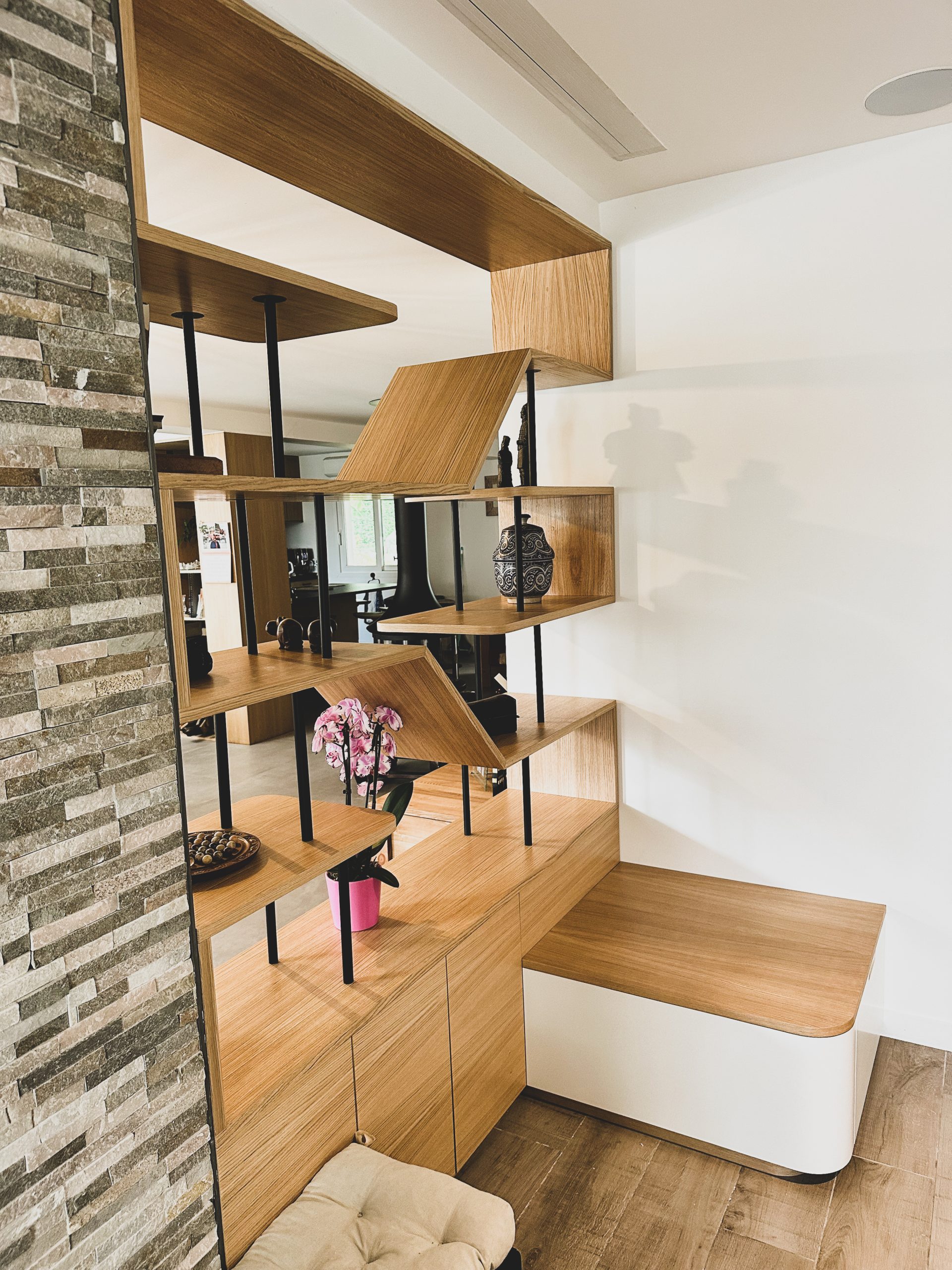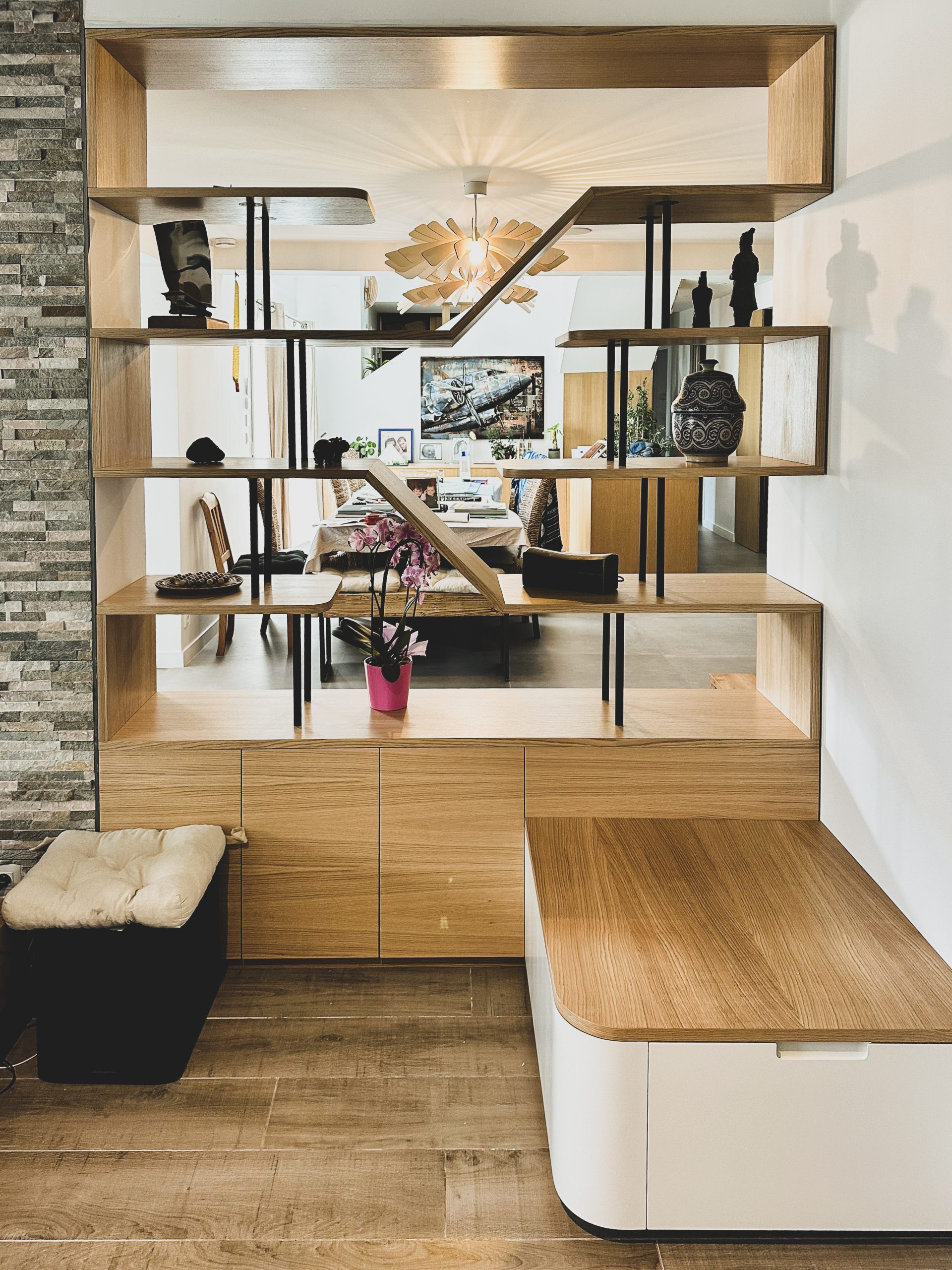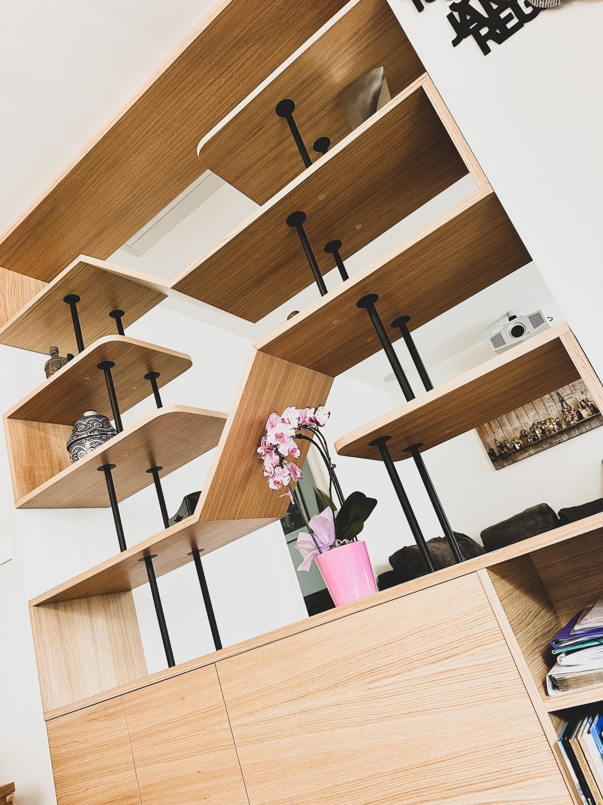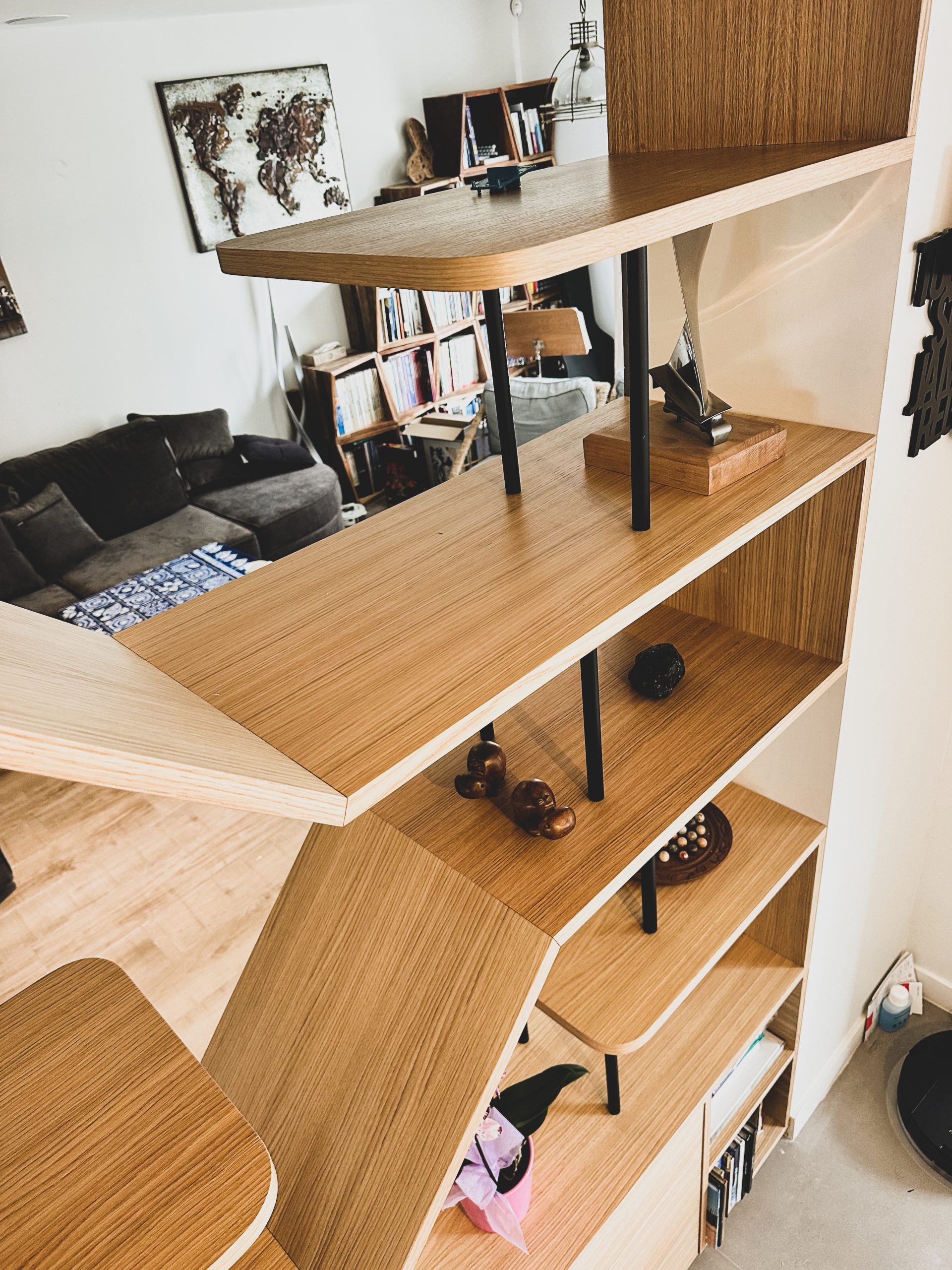 Création d'une bibliothèque traversante design et aérienne qui s'intégre à un espace sans marquer sa présence.