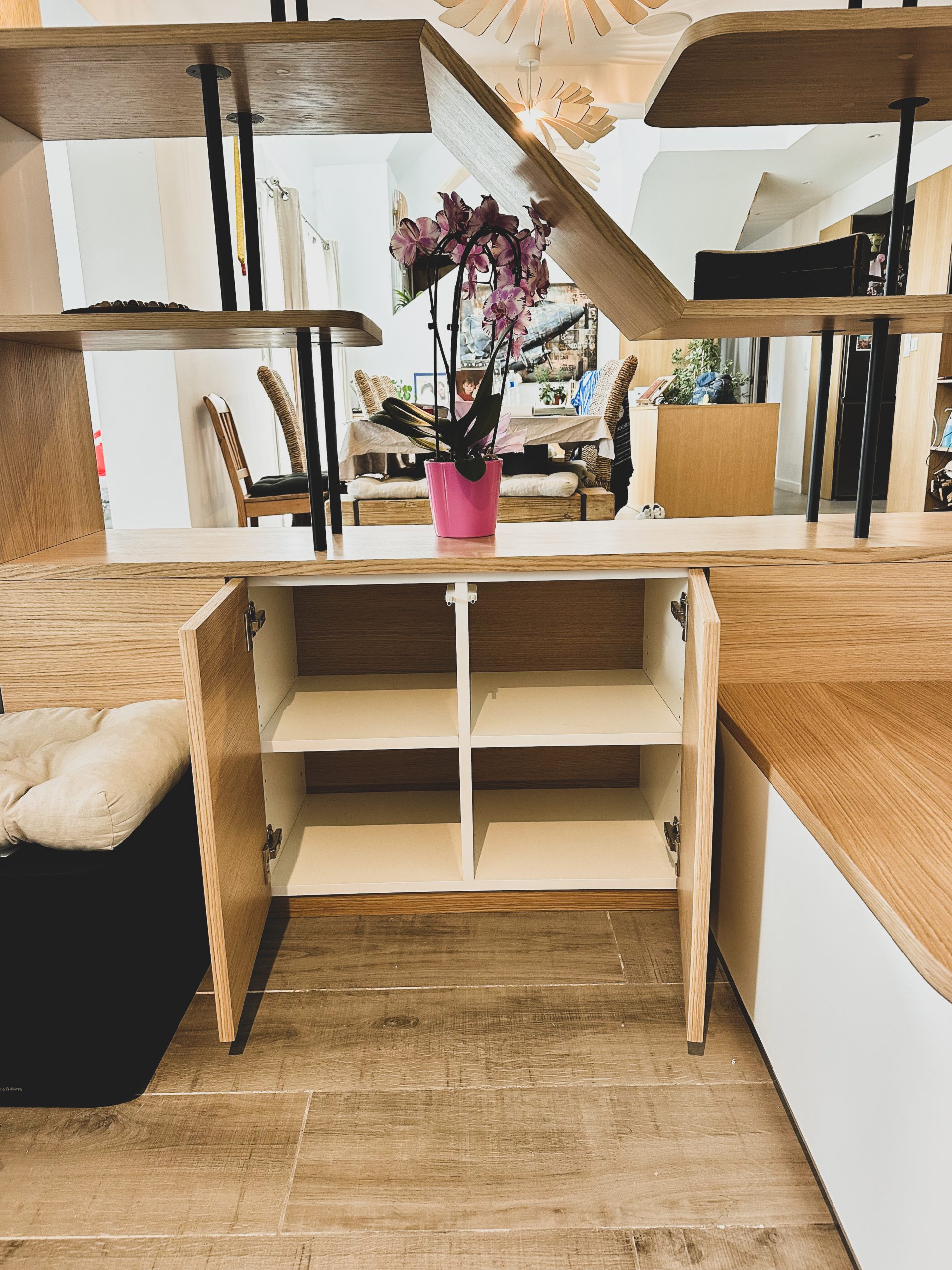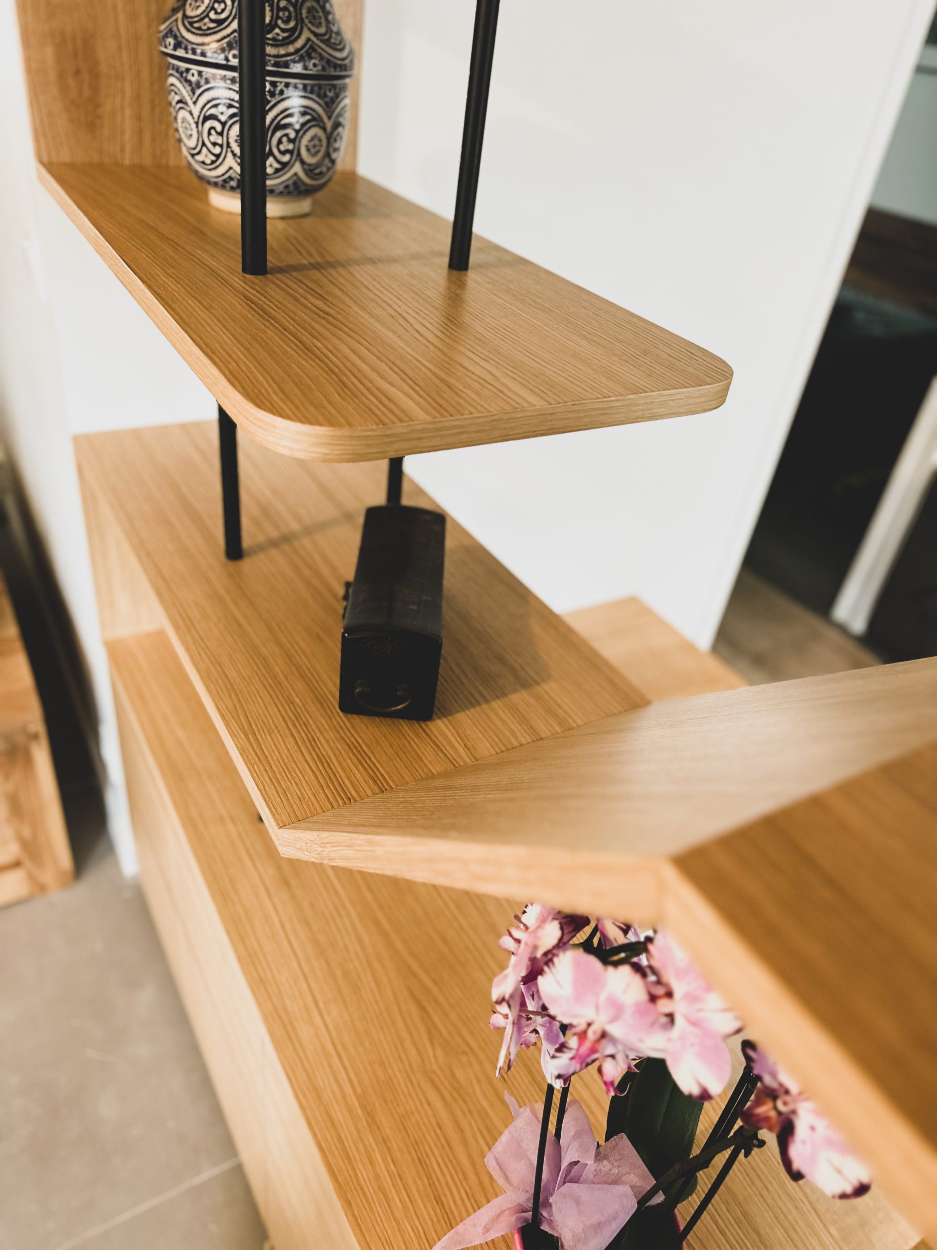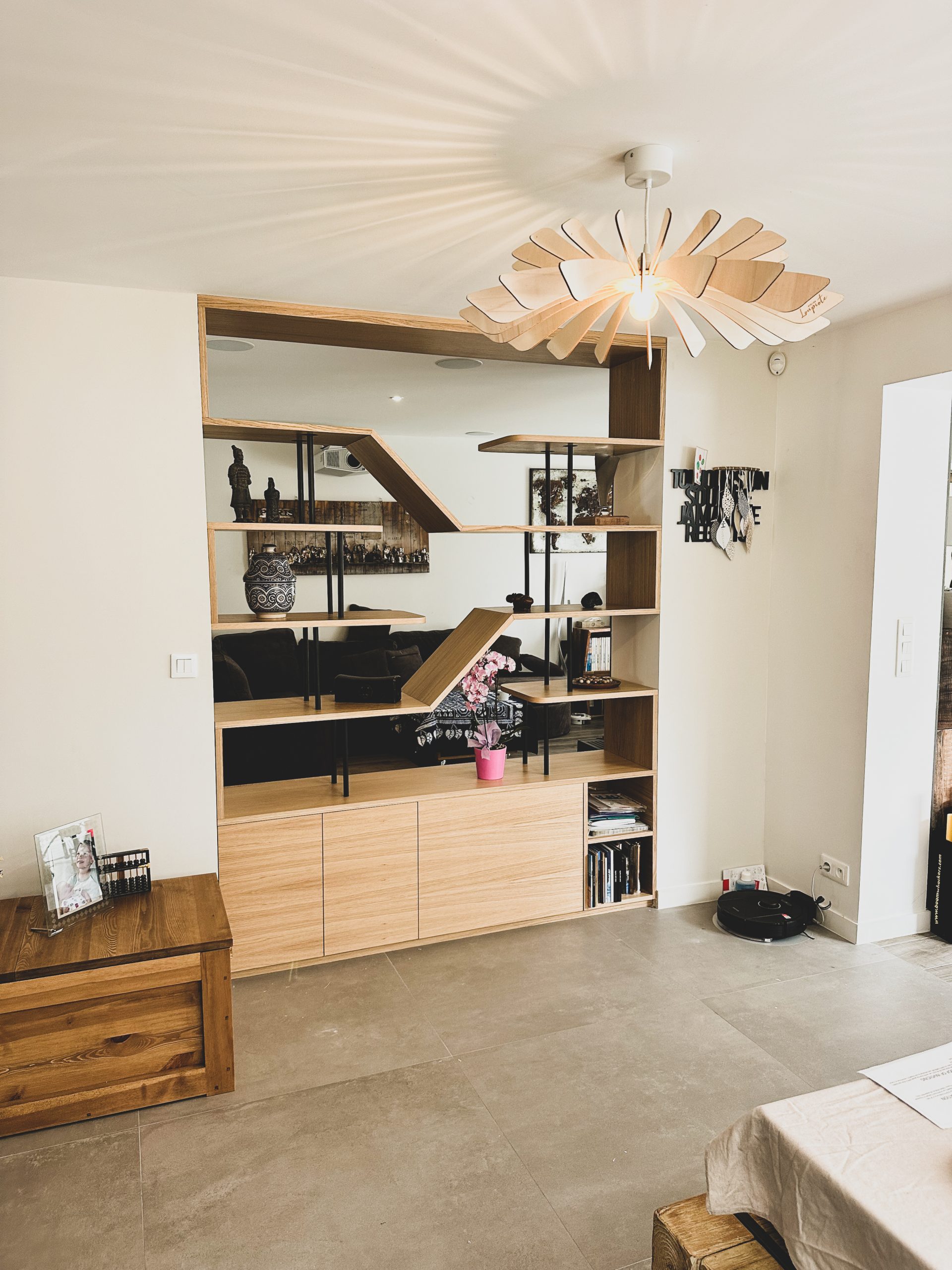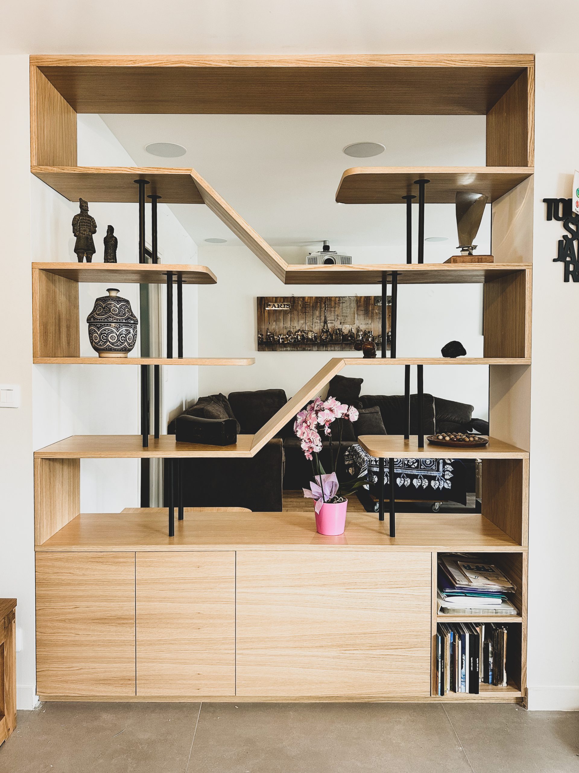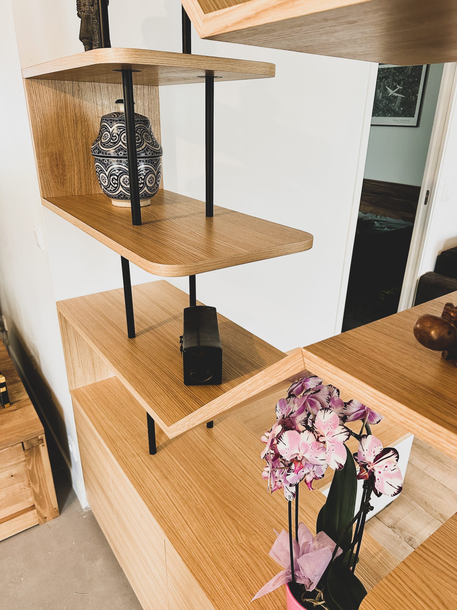 Création d'une bibliothèque traversante design et aérienne qui s'intégre à un espace sans marquer sa présence.