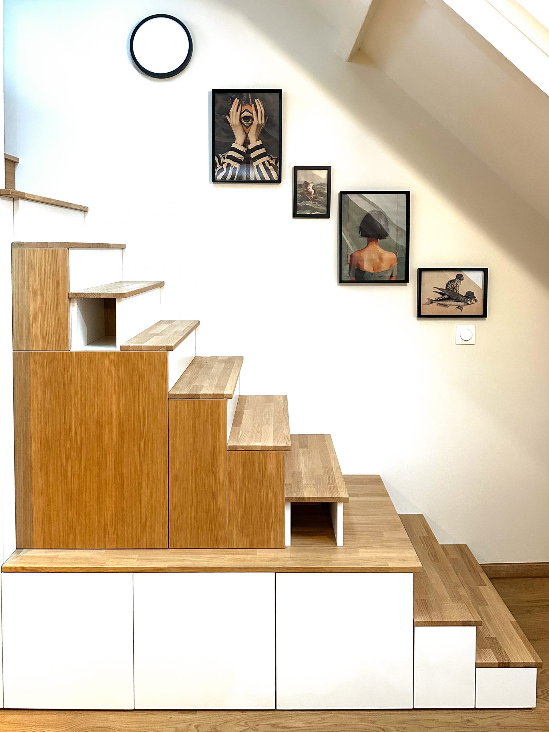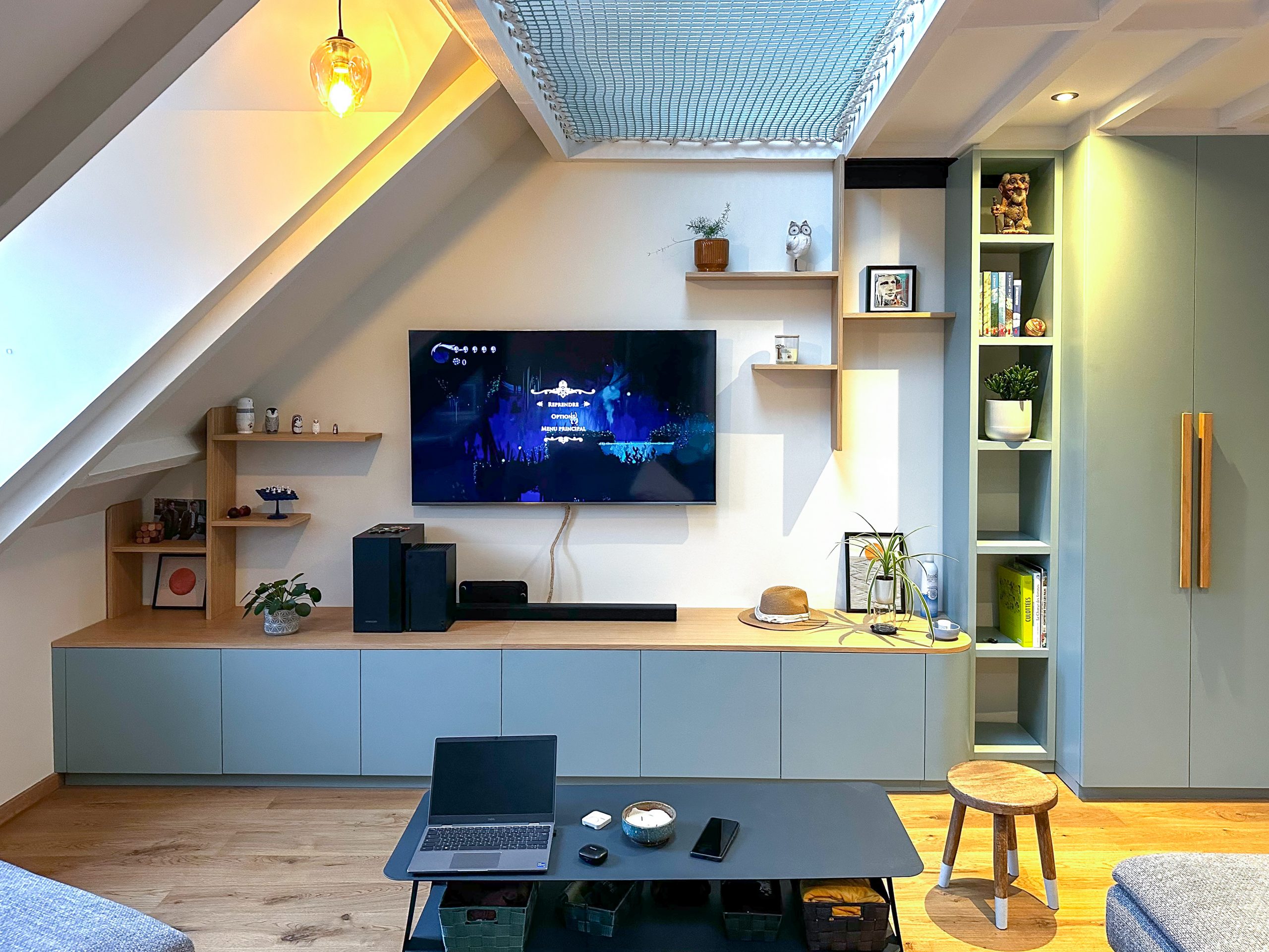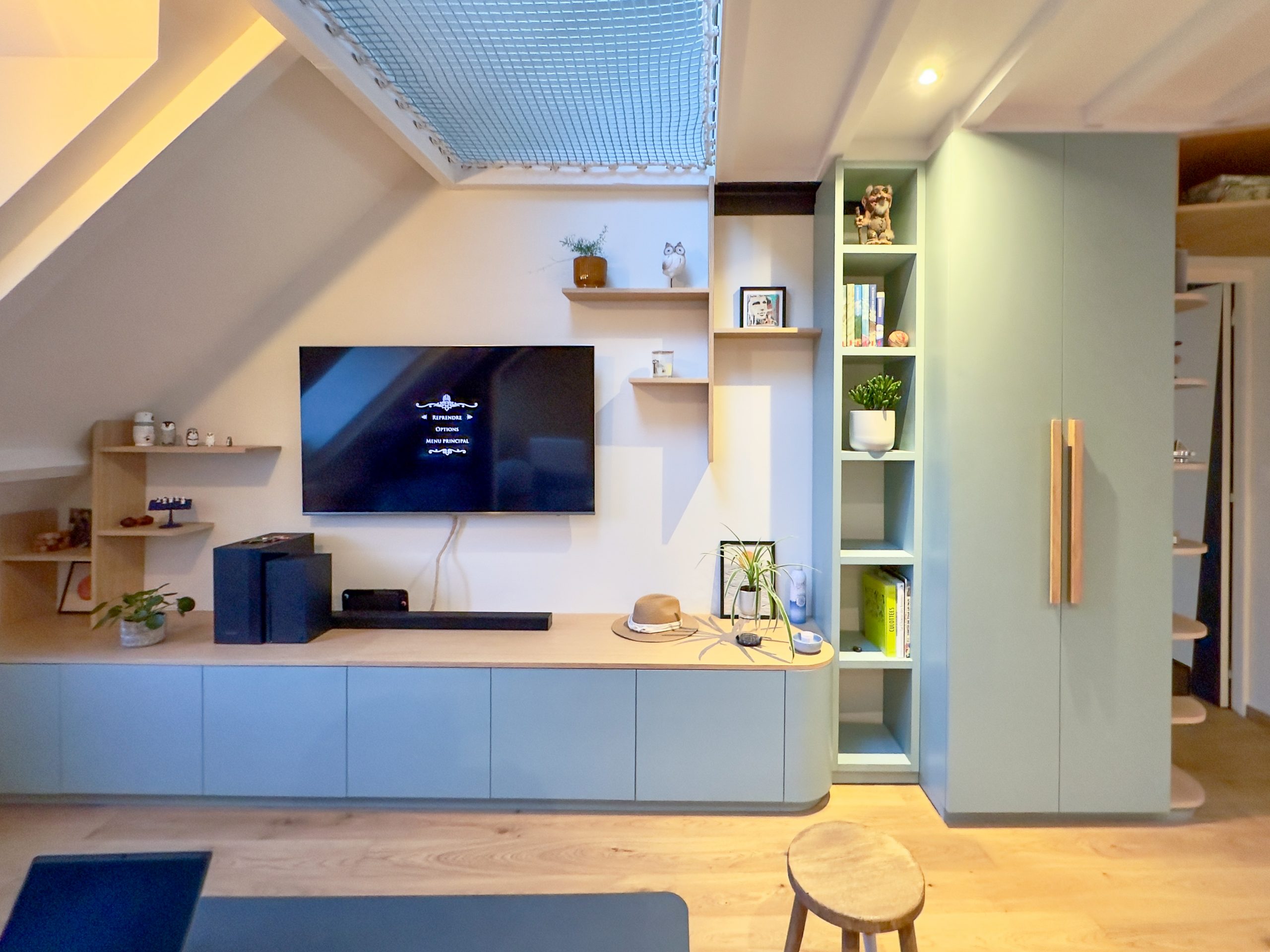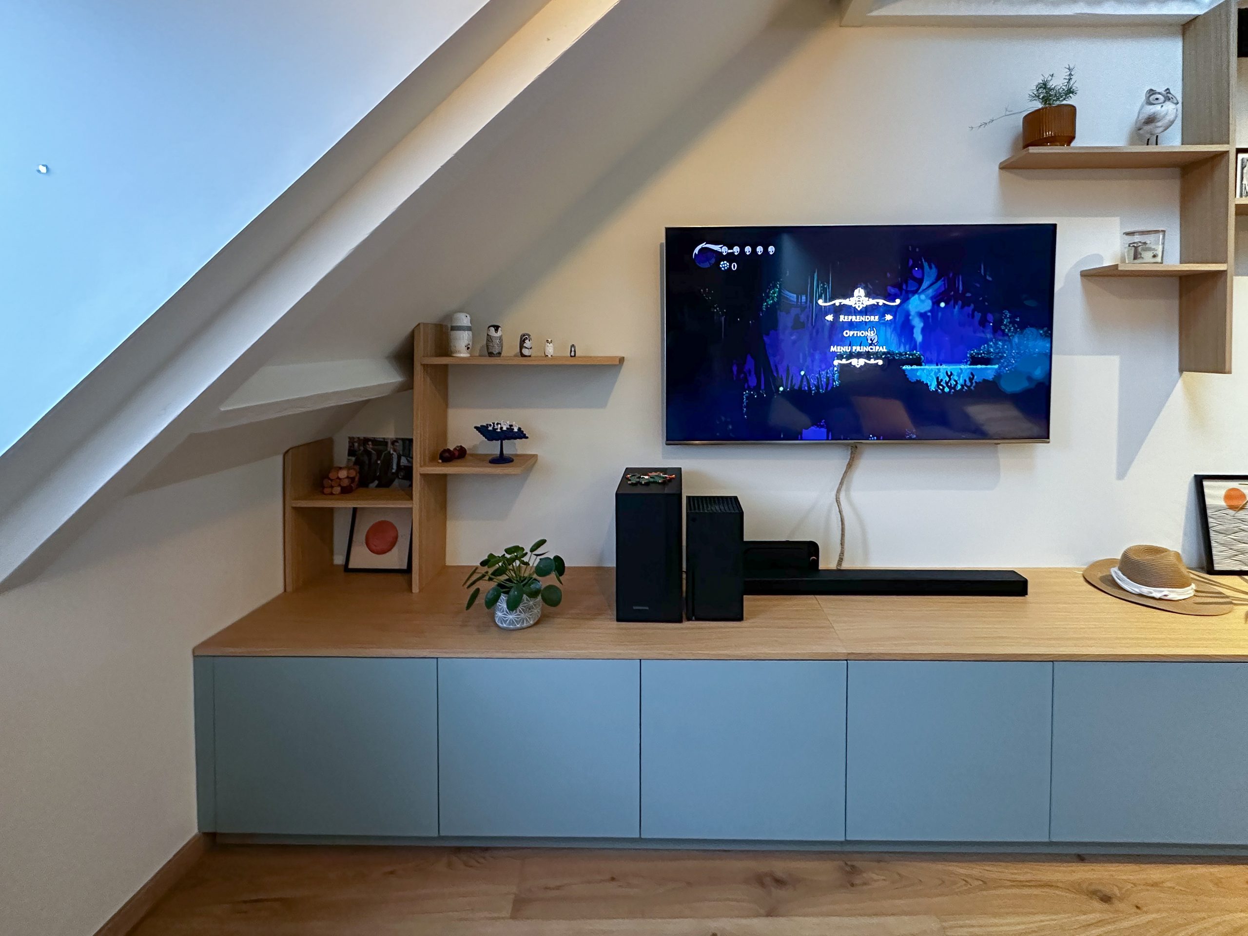 Création d'un ensemble de meubles : meuble TV, rangements, bibliothèque et escalier.