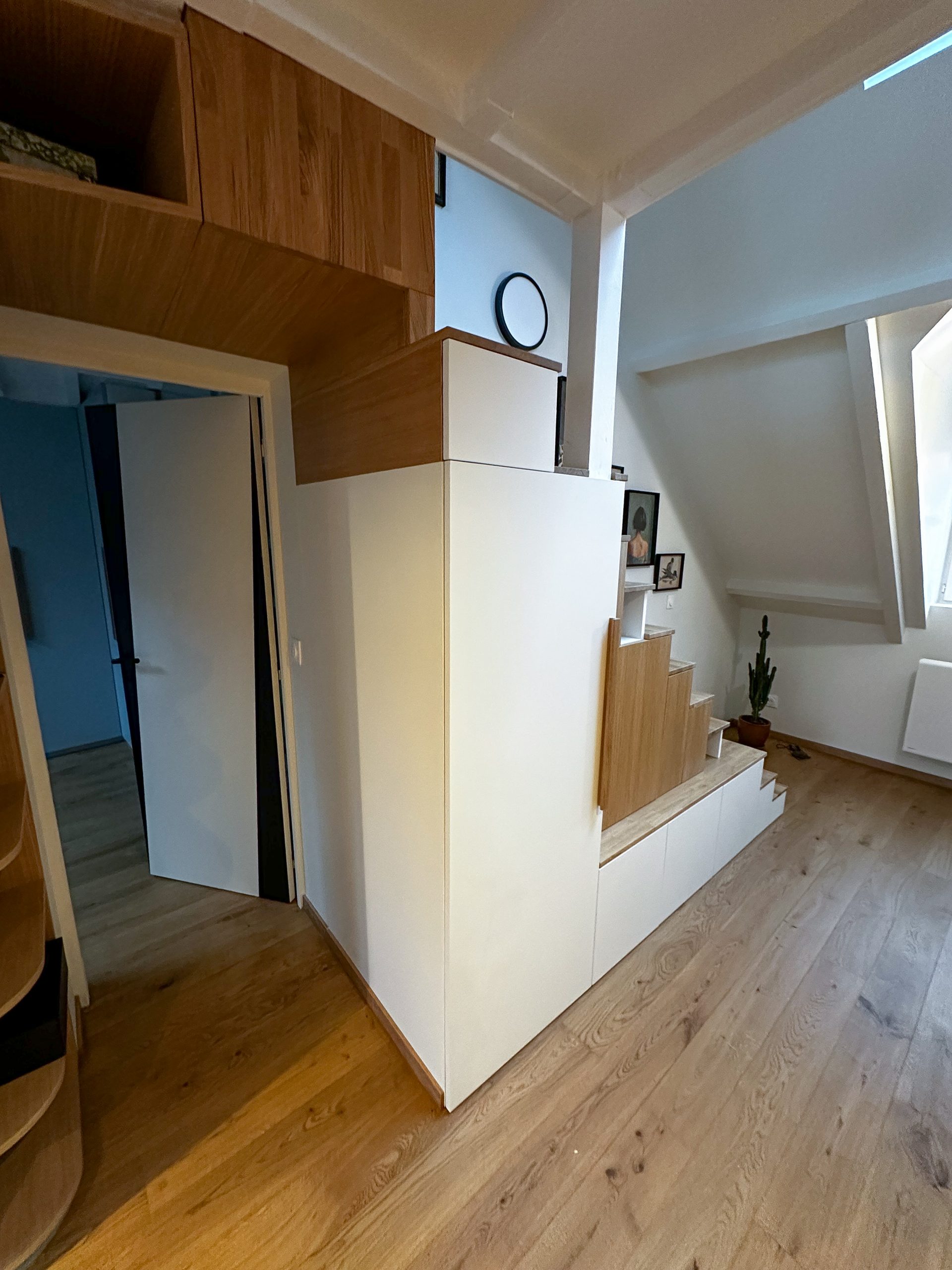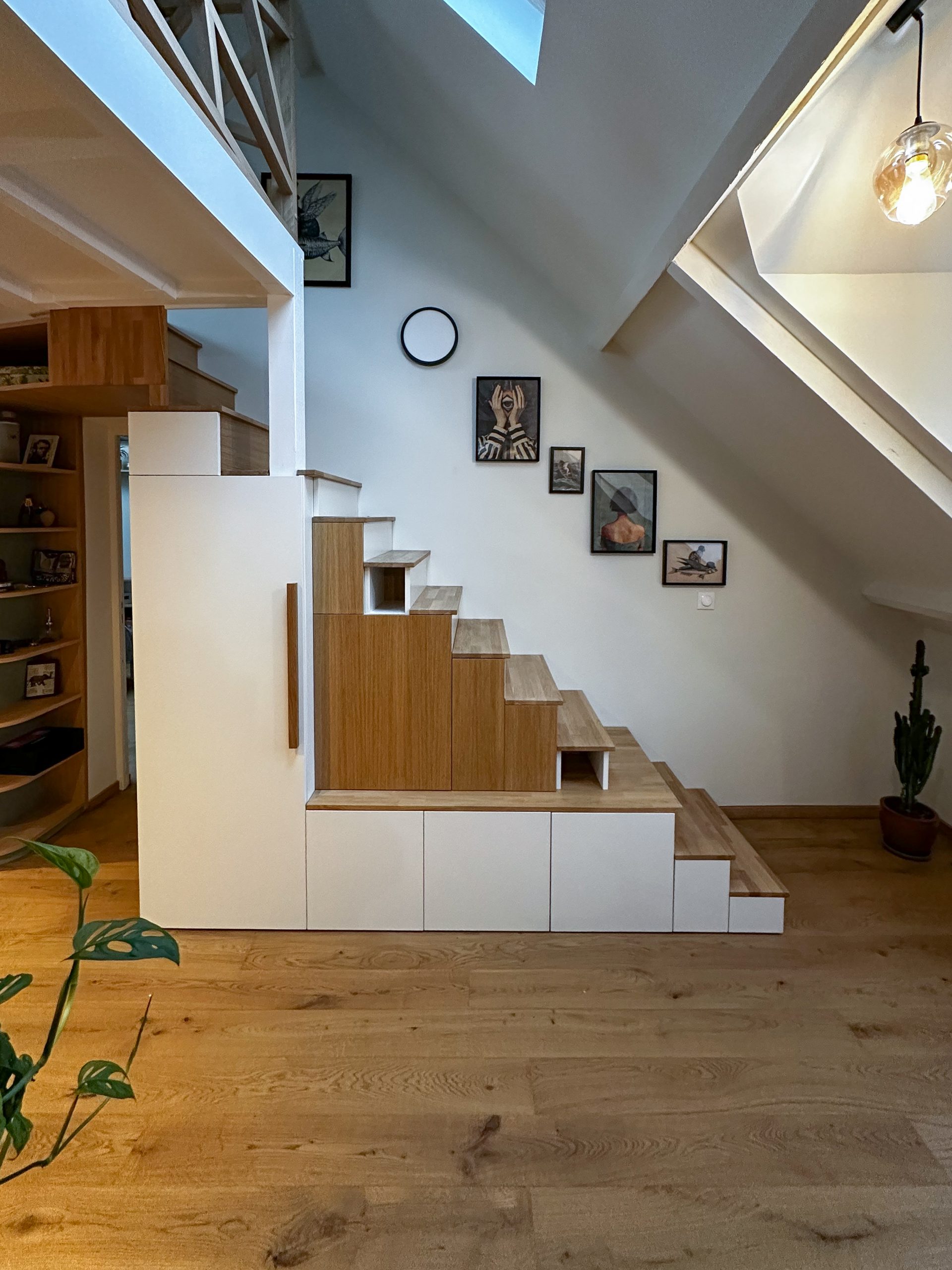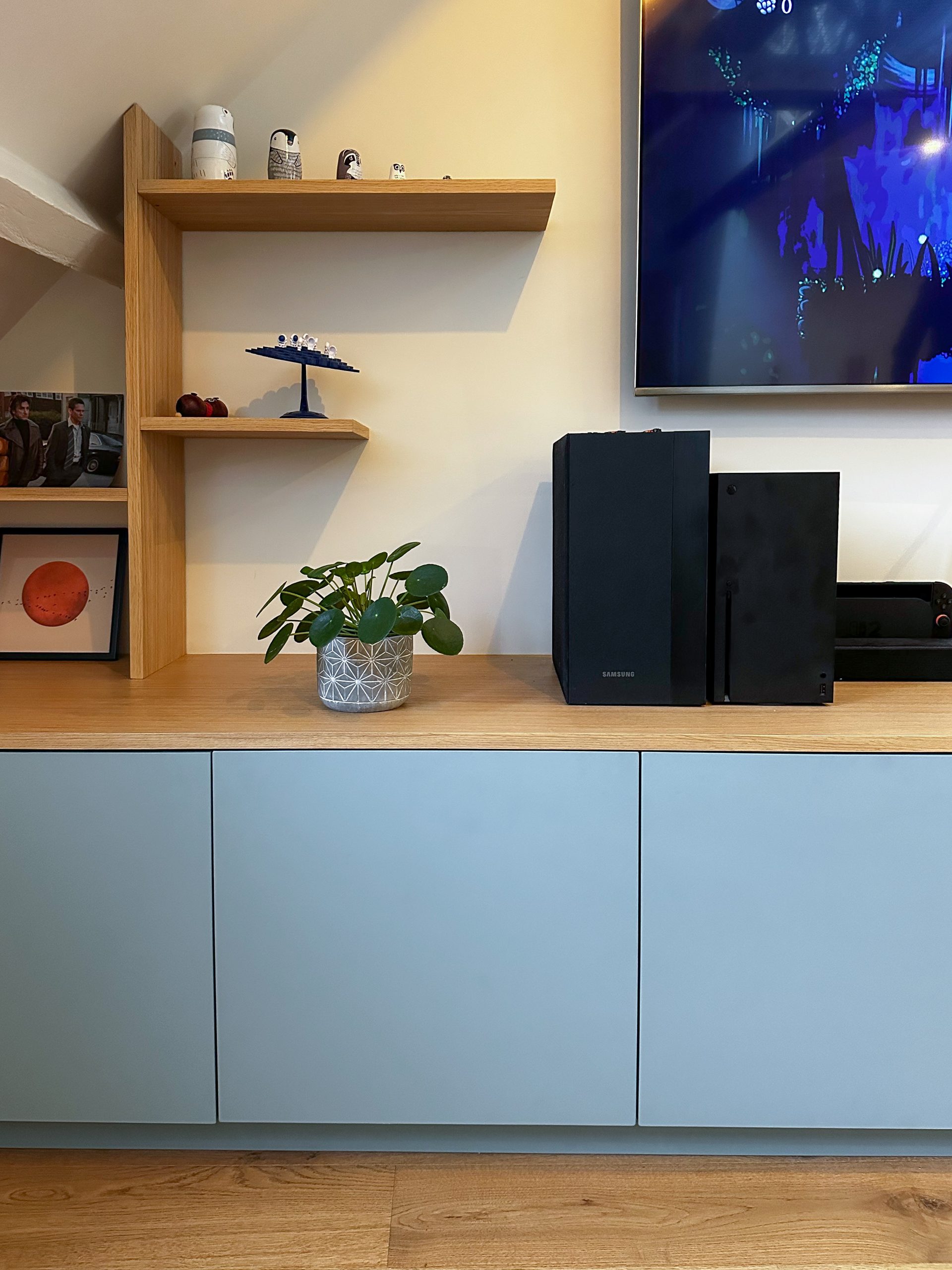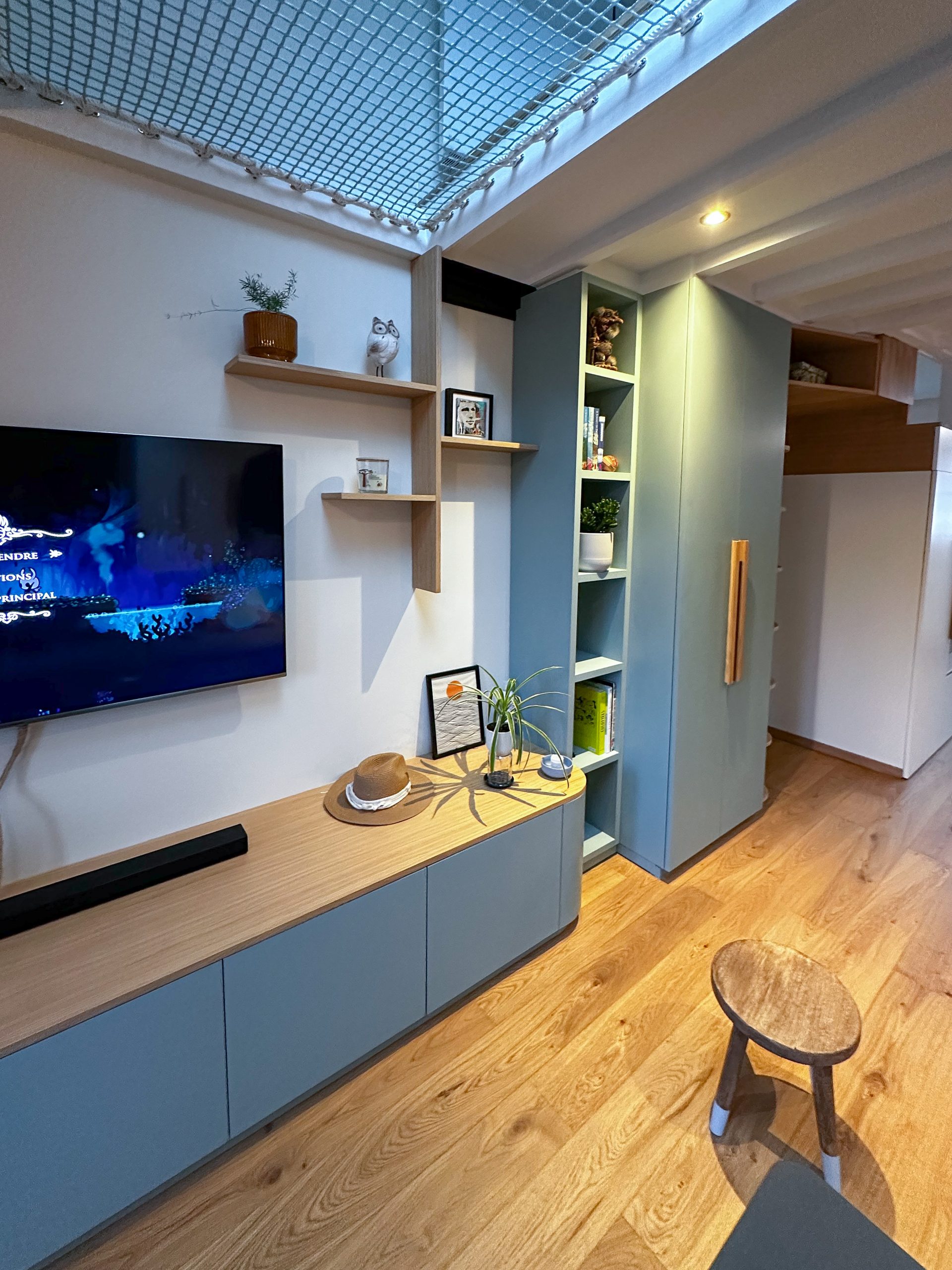 Création d'un ensemble de meubles : meuble TV, rangements, bibliothèque et escalier.