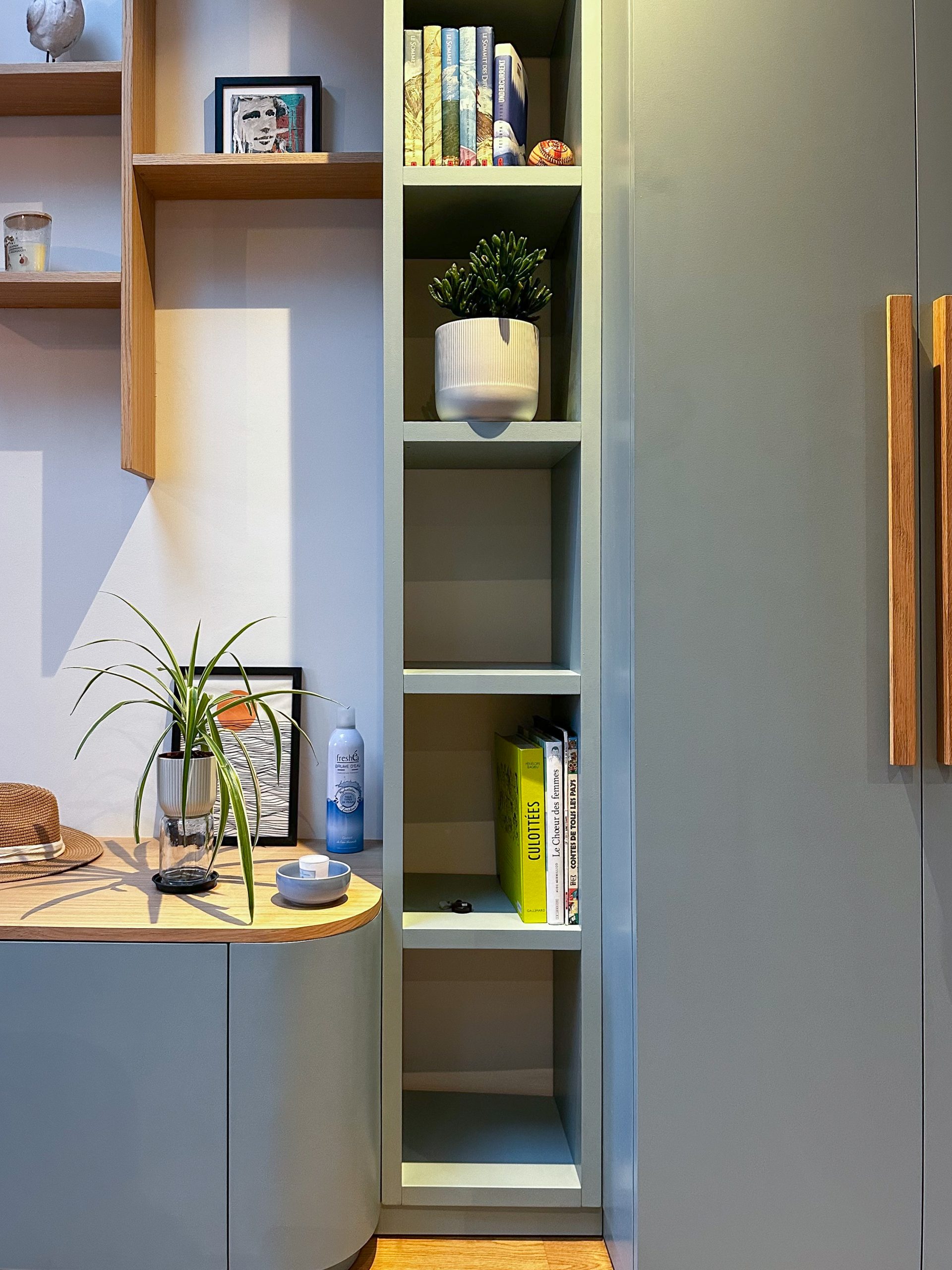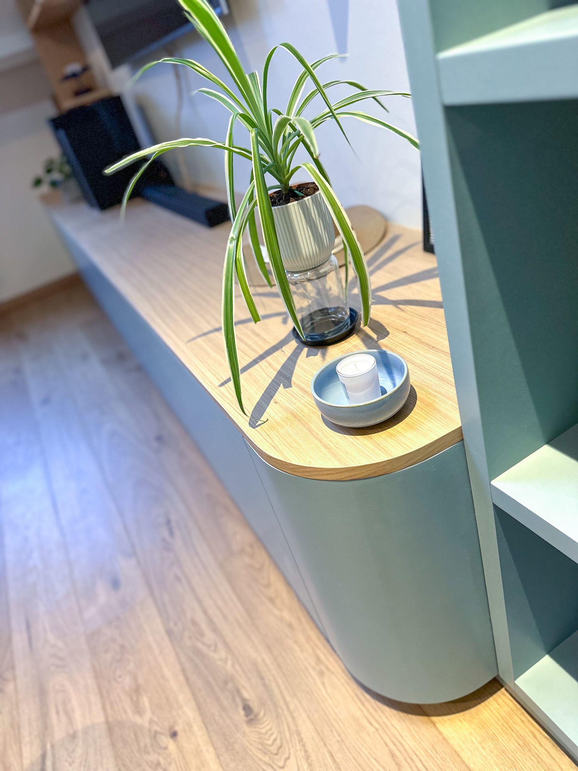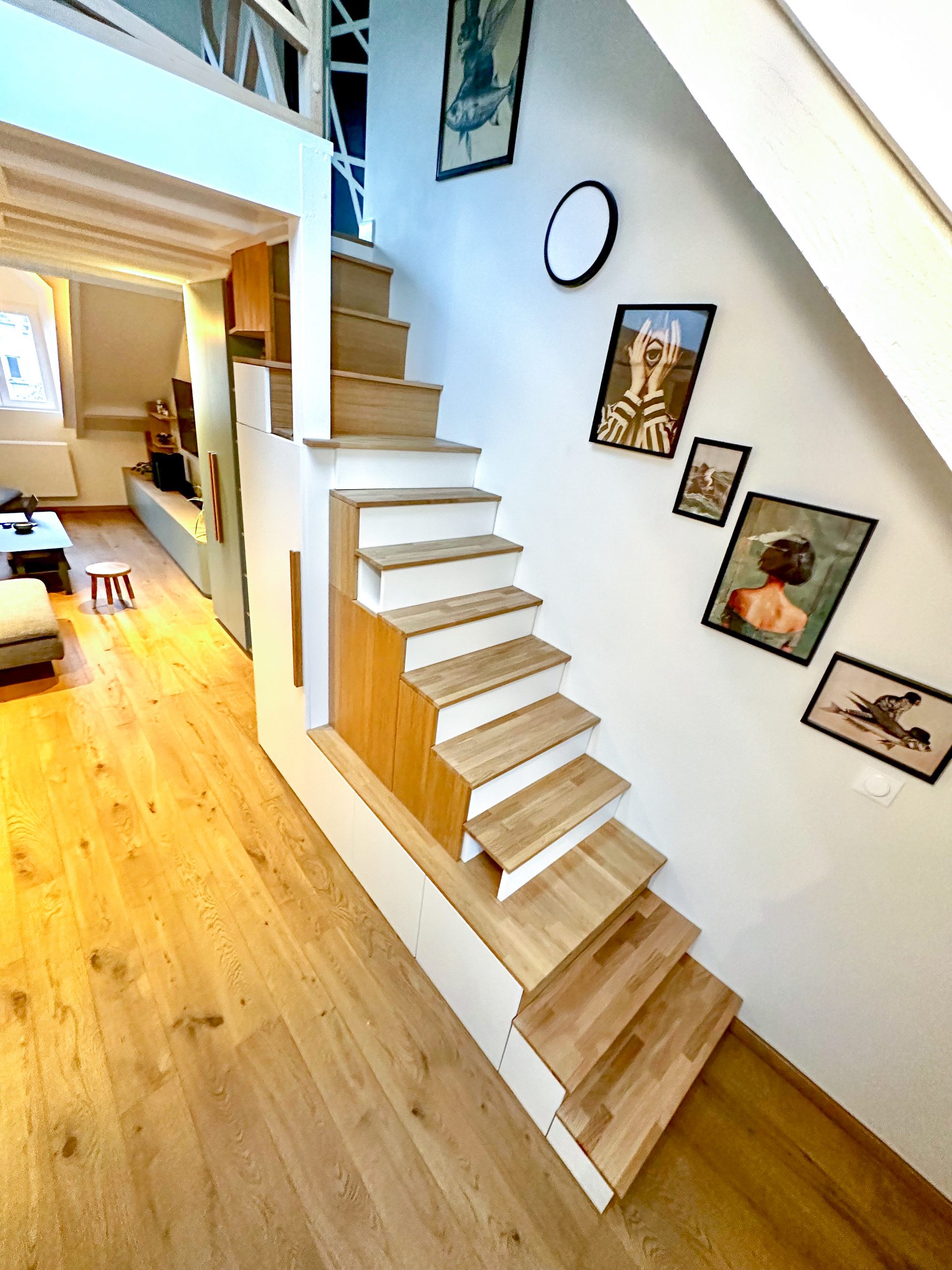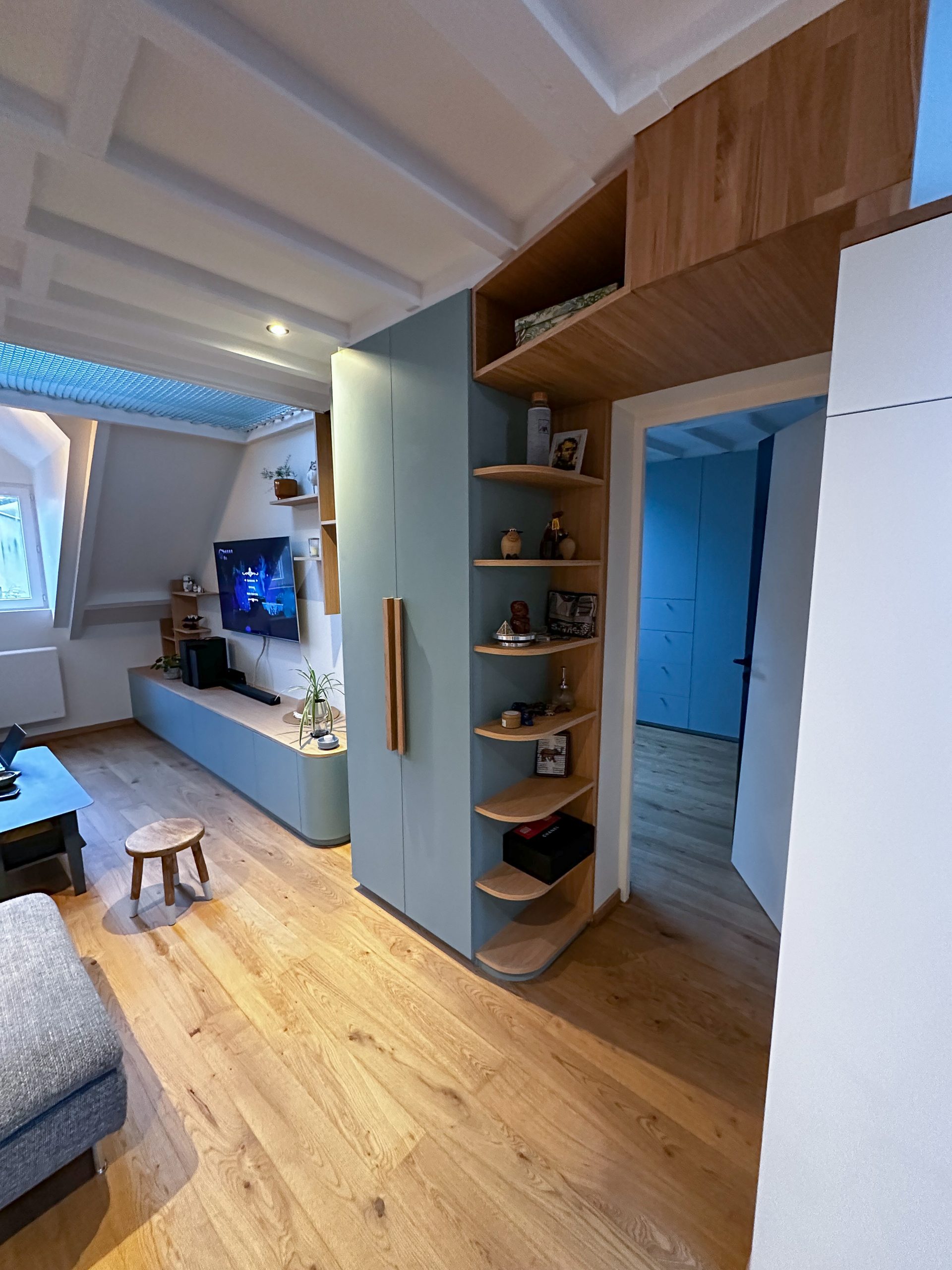 Création d'un ensemble de meubles : meuble TV, rangements, bibliothèque et escalier.