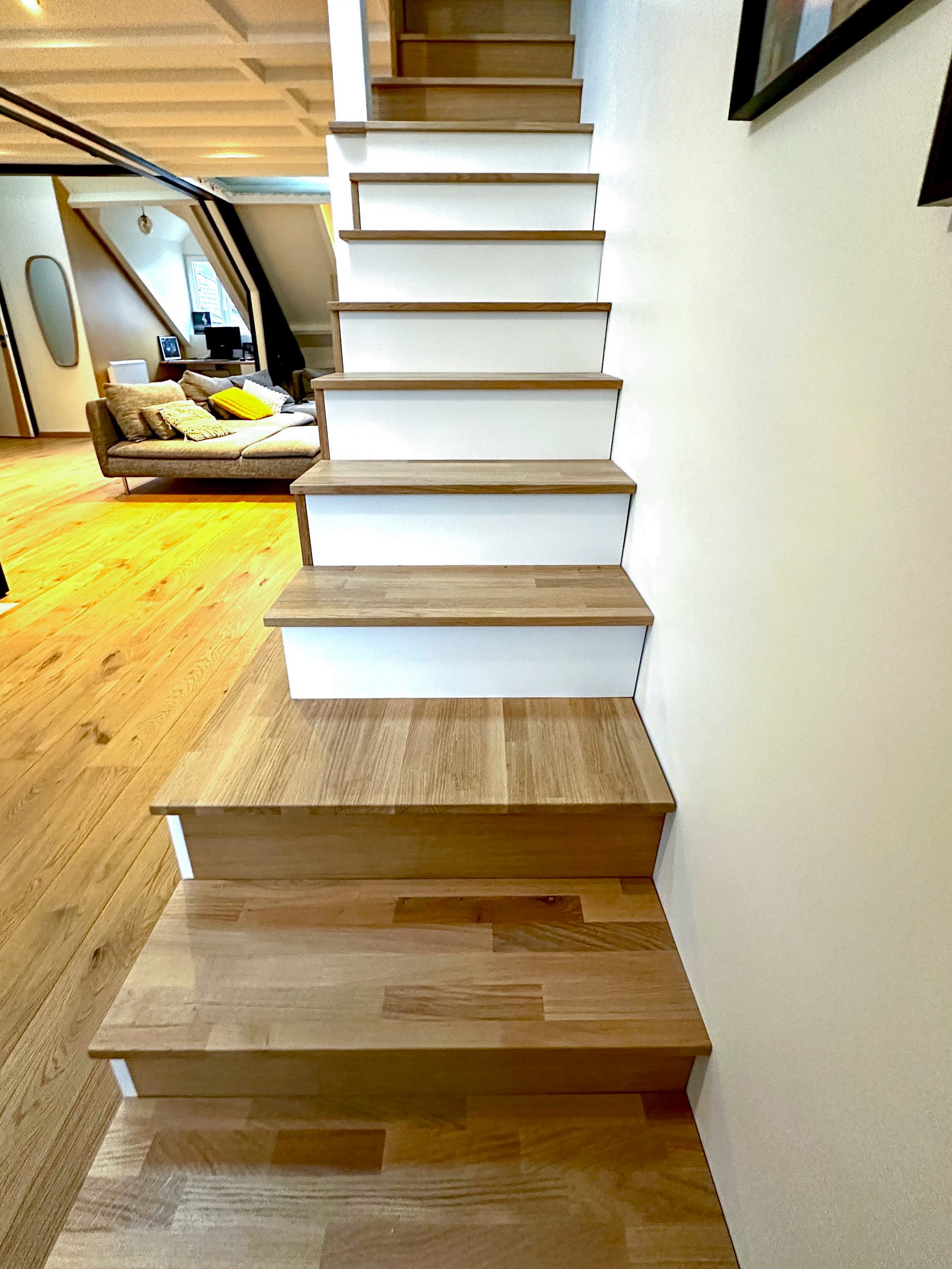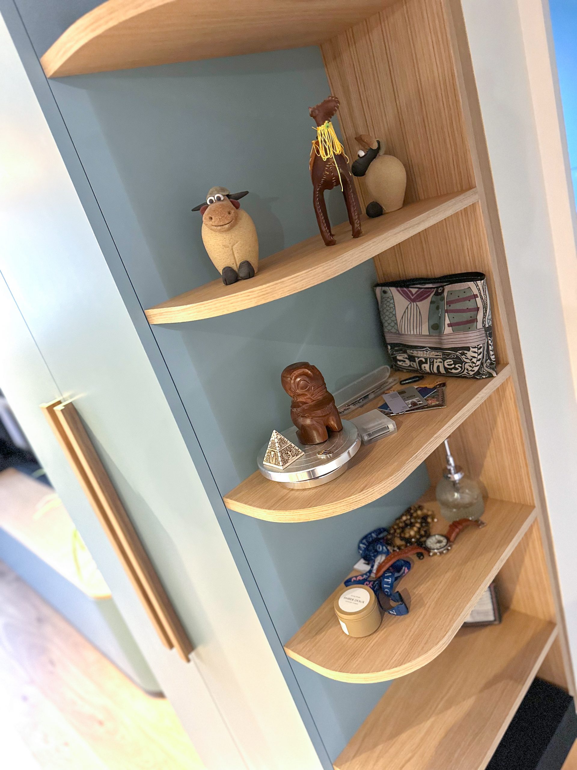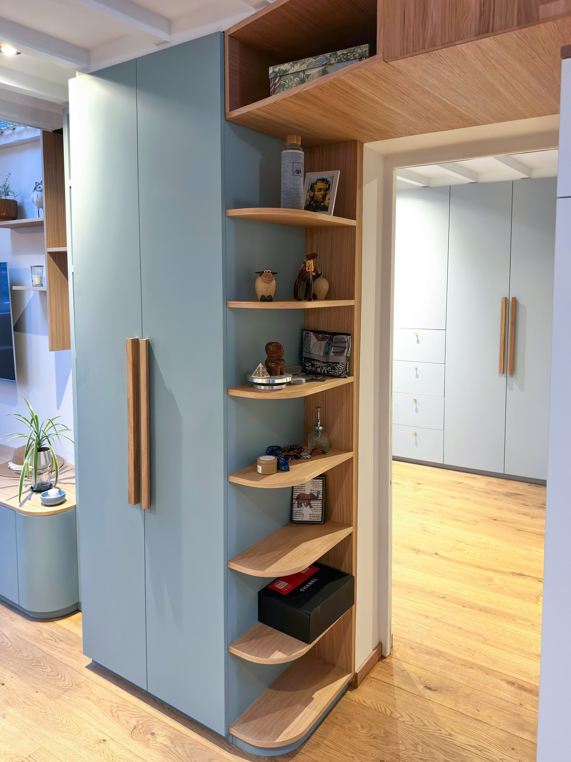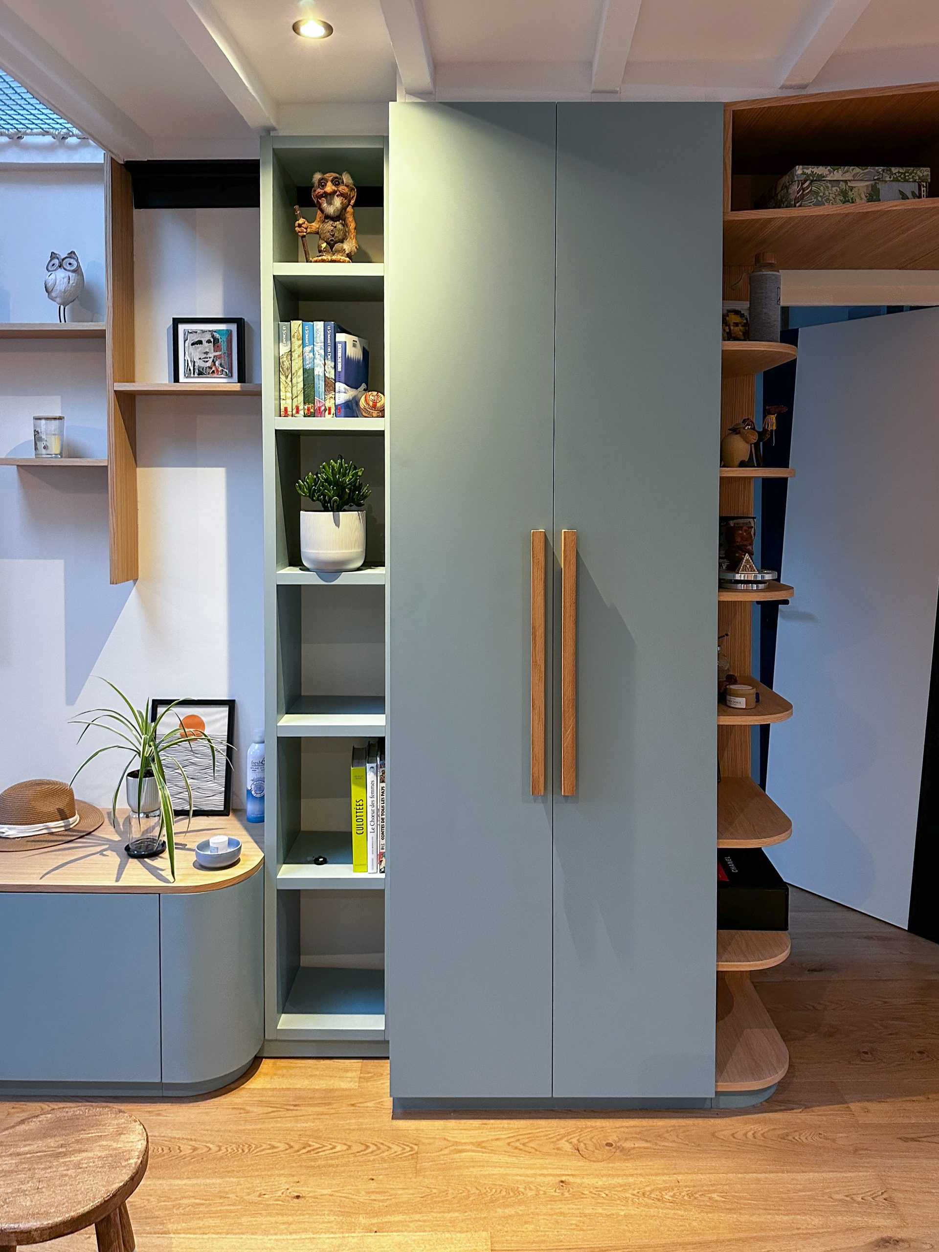 Création d'un ensemble de meubles : meuble TV, rangements, bibliothèque et escalier.